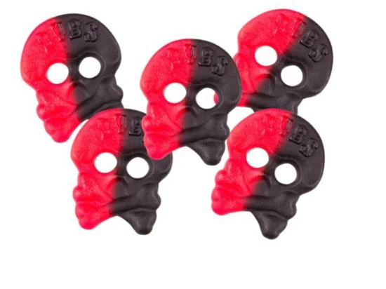 Framboos Drop Skulls zijn grote snoepjes in de vorm van schedels die smaken naar drop en framboos. Deze “Hallon Lakritsskalle” uit Zweden worden gemaakt door Bubs, een van de grootste producenten van drop en snoep in Scandinavië